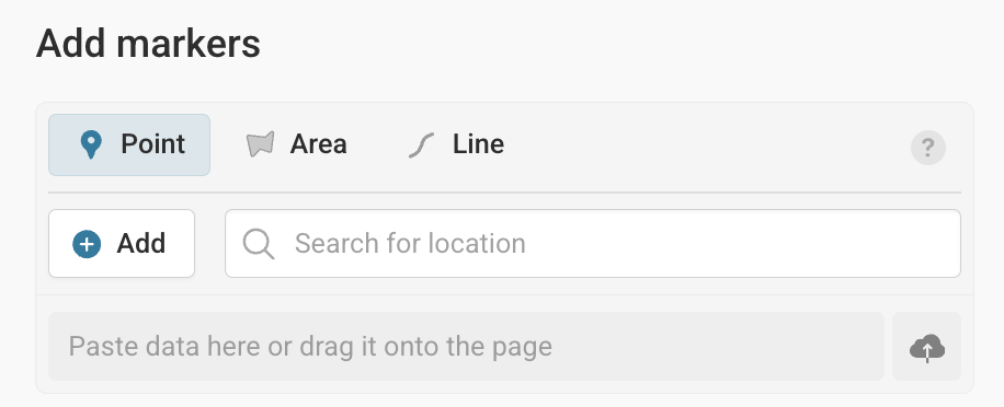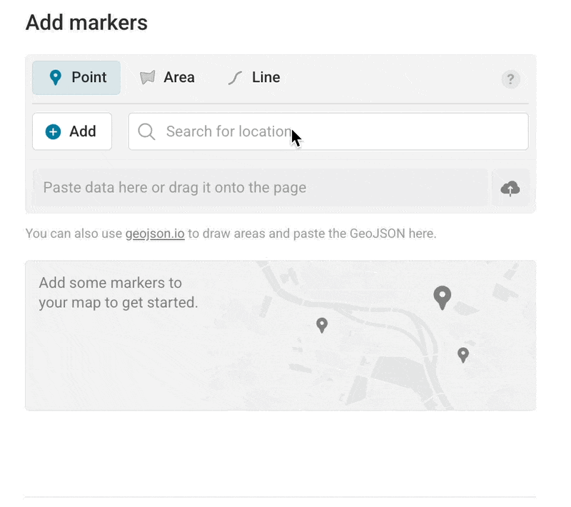 Import your point markers (and also lines and areas) with a GeoJSON or CSV. To learn more about this setting, visit the articles "How to import point markers" and "How to import area and line markers."