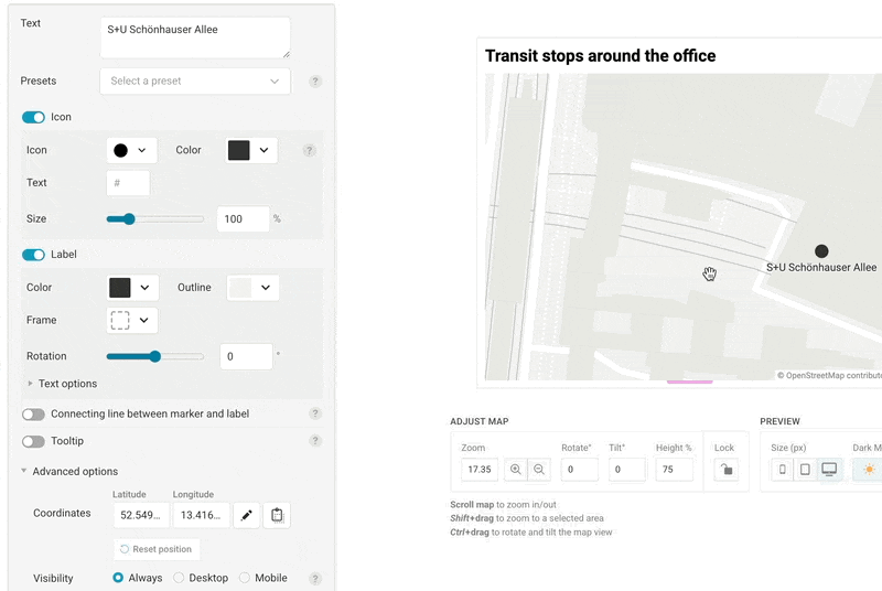 If you want to change the precise coordinates of your marker, you can click on a marker in the marker list, then on "Advanced options," and then change the latitude and longitude via the text boxes (click on the numbers to change them). If you dragged the marker away from the original position, a "Reset" button will appear: