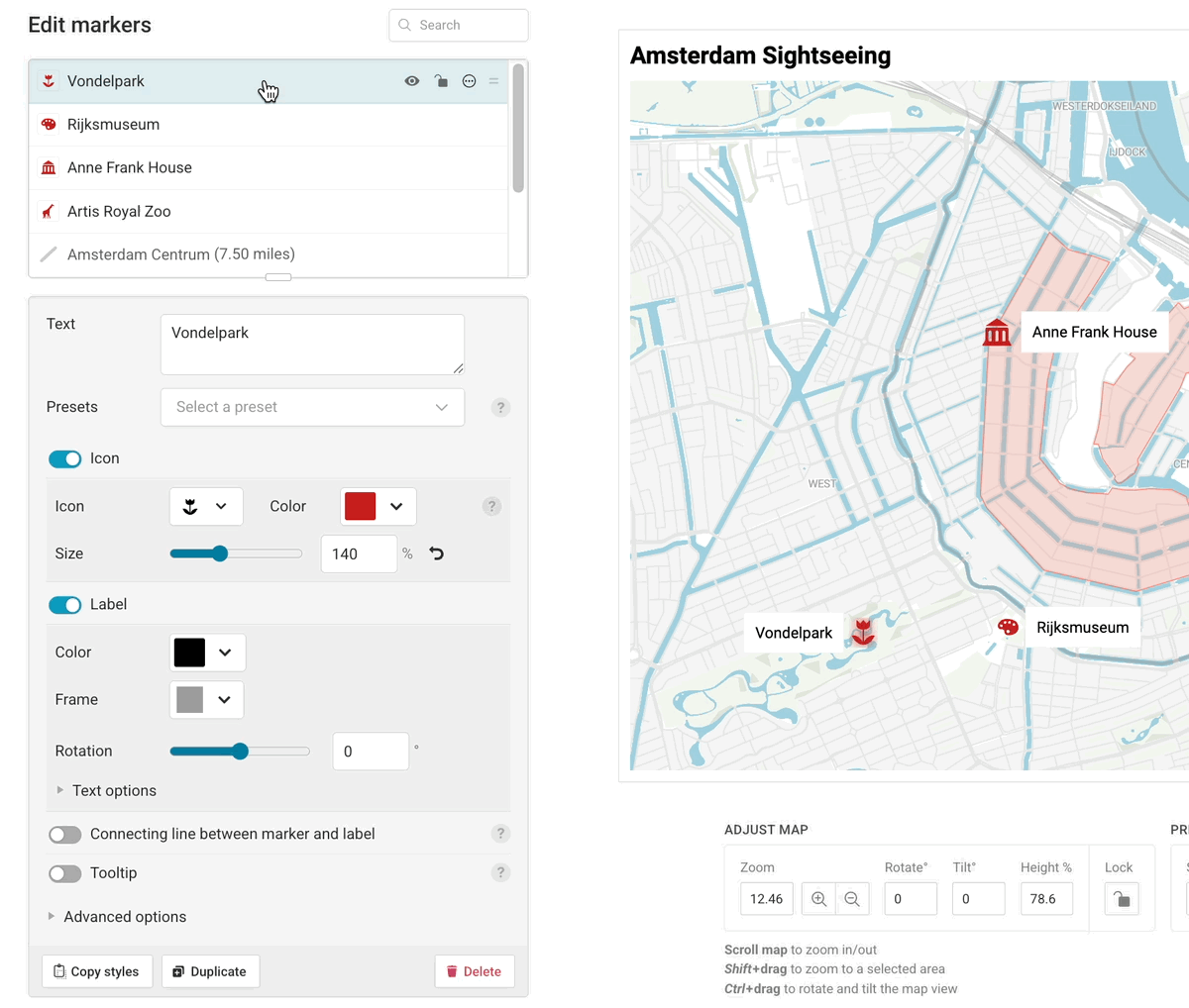 Datawrapper offers a powerful way to add tooltips to locator maps, and in this article, you'll learn how to use them. We'll take this map of Amsterdam as an example. Try to hover over the markers to see the tooltips: