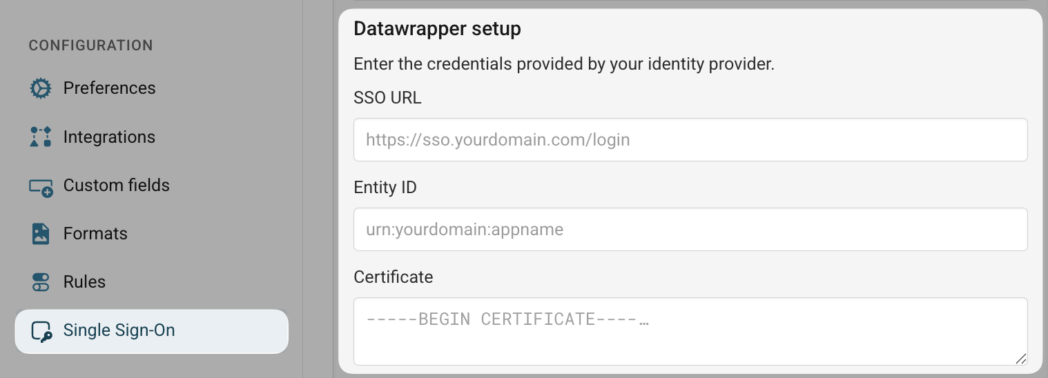 - Copy the first two values into the SSO URL and Entity ID fields in Datawrapper. Access the certificate as raw text by opening the file in a text editor and copy the text into the Certificate field: