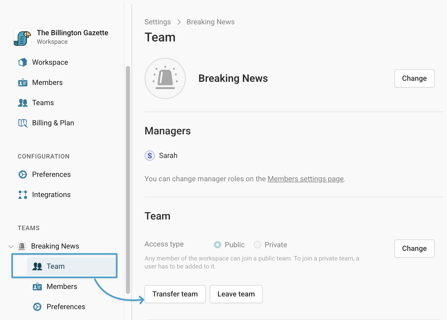 - All members from the transferred team will also have access to all public teams of the target workspace.