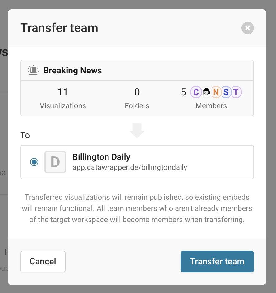 You may find yourself wanting to move a team to a different workspace — perhaps the team needs to be shared with different users or it was simply created in the wrong workspace. Luckily, Datawrapper offers a very easy way to do so. To transfer a team to another workspace, you need to be an admin or manager of both workspaces.