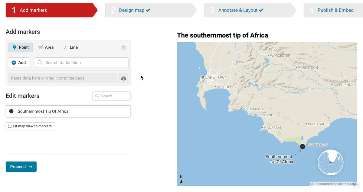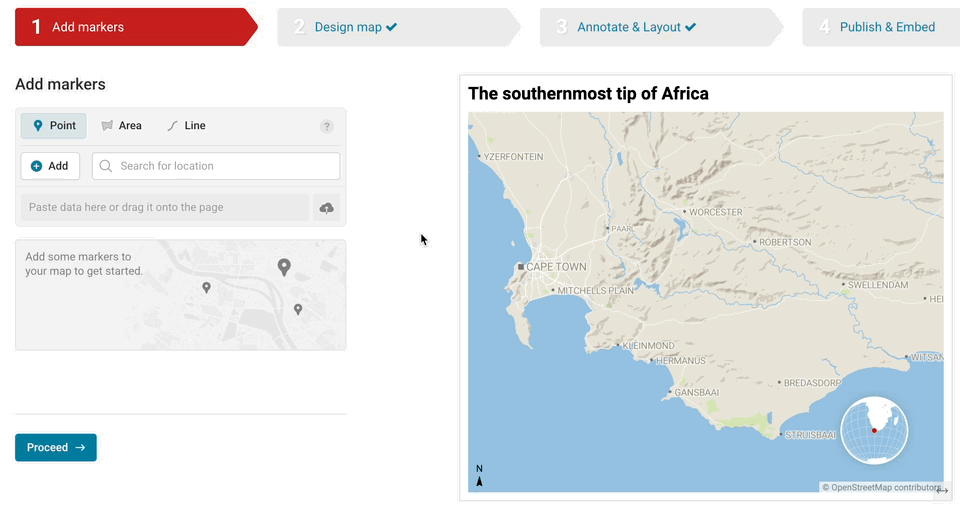 To create a locator map, go to datawrapper.de and click on "New Map" and then "Locator map." This will open the locator map creation pipeline. Four steps will lead you to your final map: 1: Add markers, 2: Design map, 3: Annotate, and 4: Publish. In this article, we will focus on adding markers.