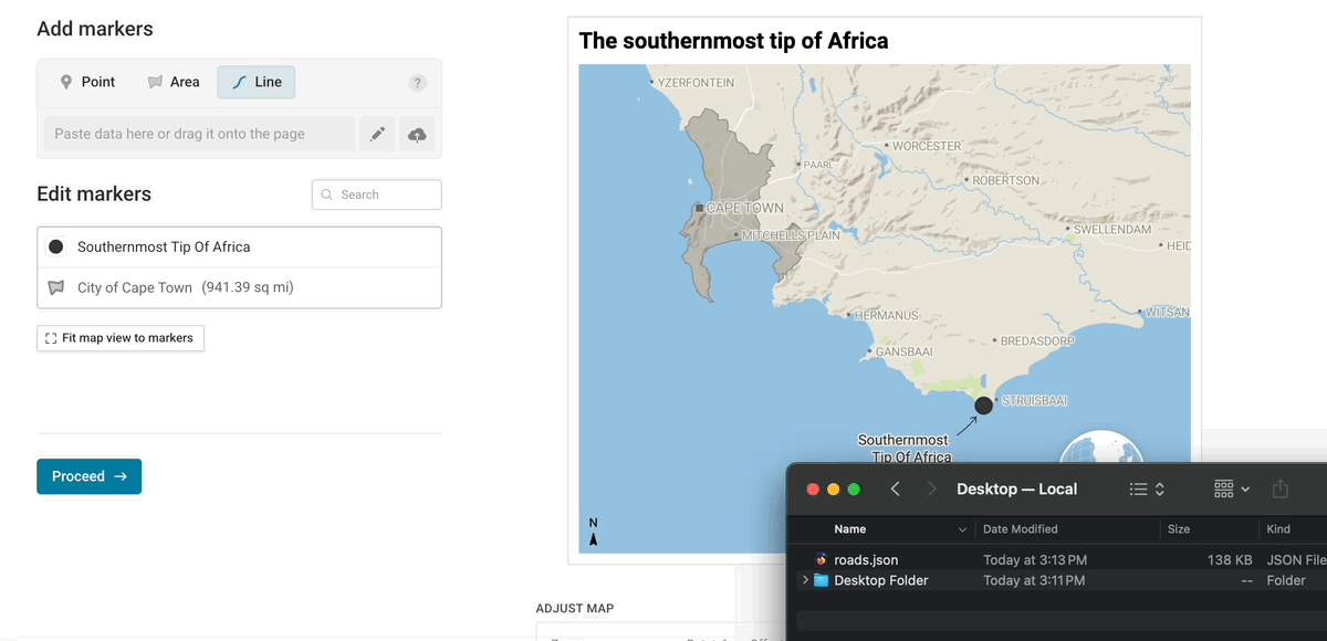 If you have a lot of markers to upload, or precise geodata for your markers, uploading a file containing those markers might be a great option. Locator maps support GeoJSON, CSV, GPX, or KML files, which can enclose information about all three of our different marker types. File uploads have some prerequisites to be used in Datawrapper; to use them in a locator map, your file needs to:
