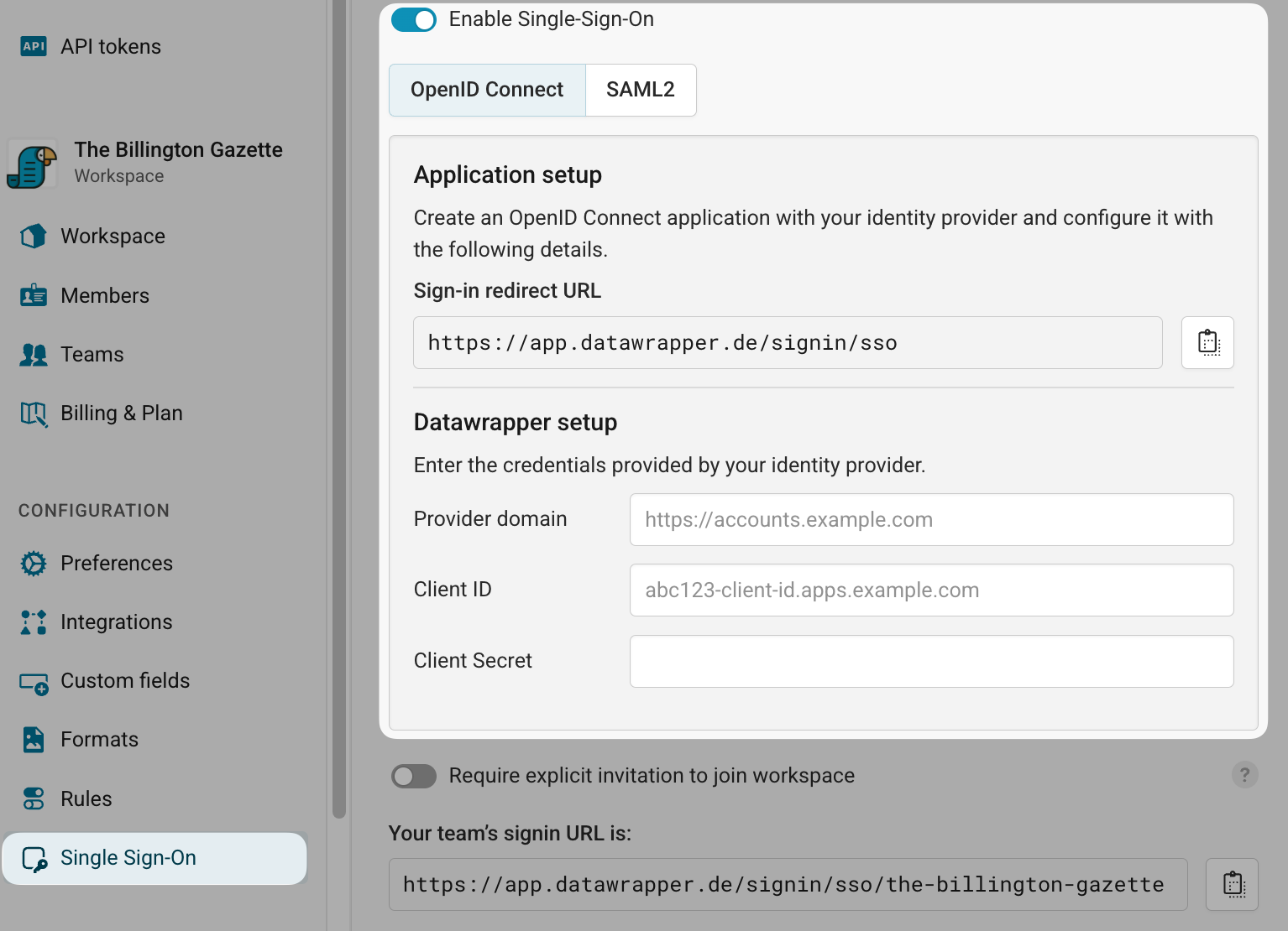 - Open your Datawrapper workspace settings and navigate to the Single Sign-On section. Enable the Enable Single-Sign-On switch and select OpenID Connect as protocol: