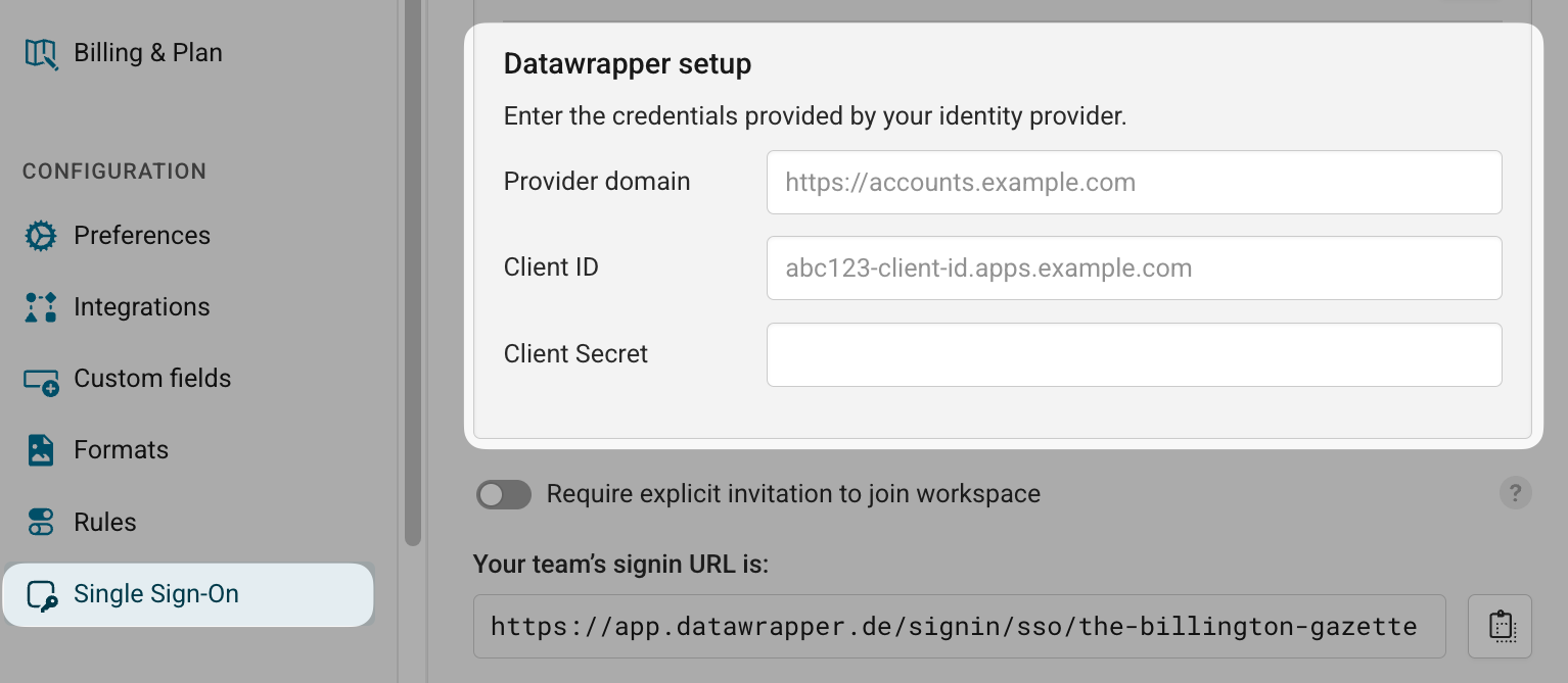 - Copy these values into the Provider domain, Client ID, and Client Secret in Datawrapper: